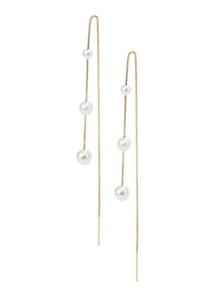 De Maren threaders zijn moderne bruidsoorbellen met drie prachtige parels aan een 925 sterling zilveren box chain met 14kt gouden plating. Deze threader kun je door meerdere piercings dragen voor een unieke look.