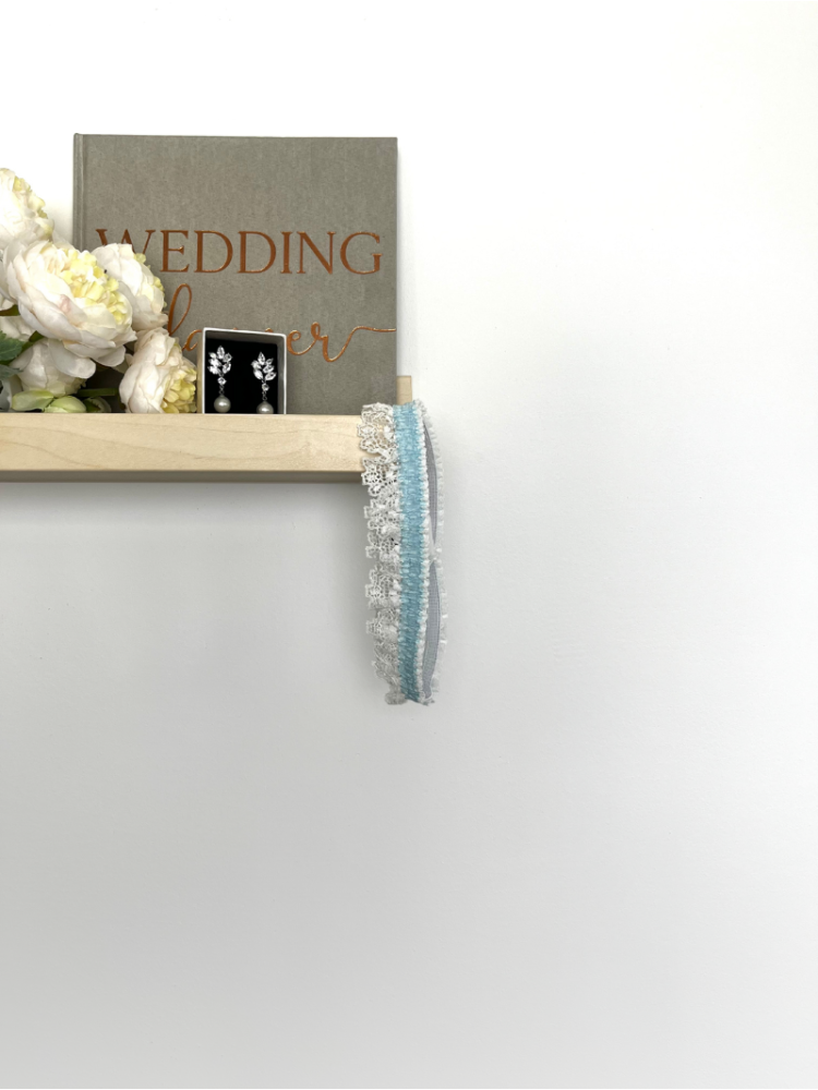 Kousenband gemaakt van fijn kant met satijnen band in ivoor en blauw.