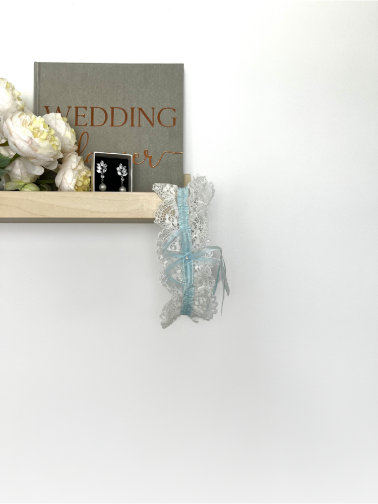 Kousenband gemaakt van fijn kant met blauwe satijnen band. Afgewerkt met strikje en rozetje.