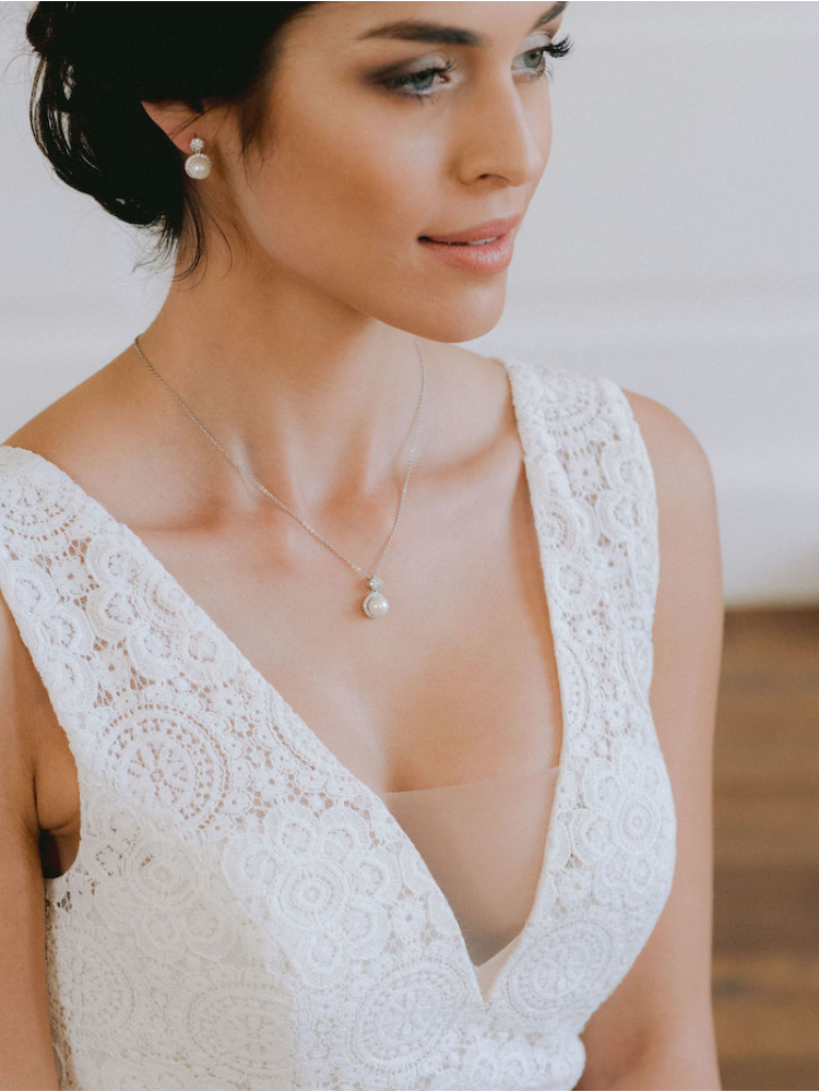 Ben jij op zoek naar sieraden die passen bij zowel jouw bruidsjurk als bij elkaar? Bekijk dan onze Sieradensets! Wanneer je kiest voor een sieradenset, bespaar je de tijd die je kwijt bent aan het zoeken naar bijpassende sieraden en ben je er zeker van dat jouw sieraden bij elkaar zullen passen. De DZ0147 Sieradenset bestaat uit oorbellen en een ketting en is zeer elegant. Door de eenvoud van deze set past het bij elke bruidsjurk!