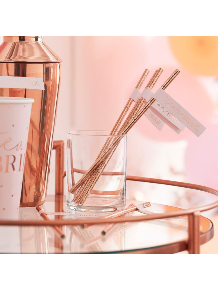 Roségouden Blush Hen 'Team Bride' rietjes, perfecte manier om cocktails te drinken op je fantastische vrijgezellenfeest!