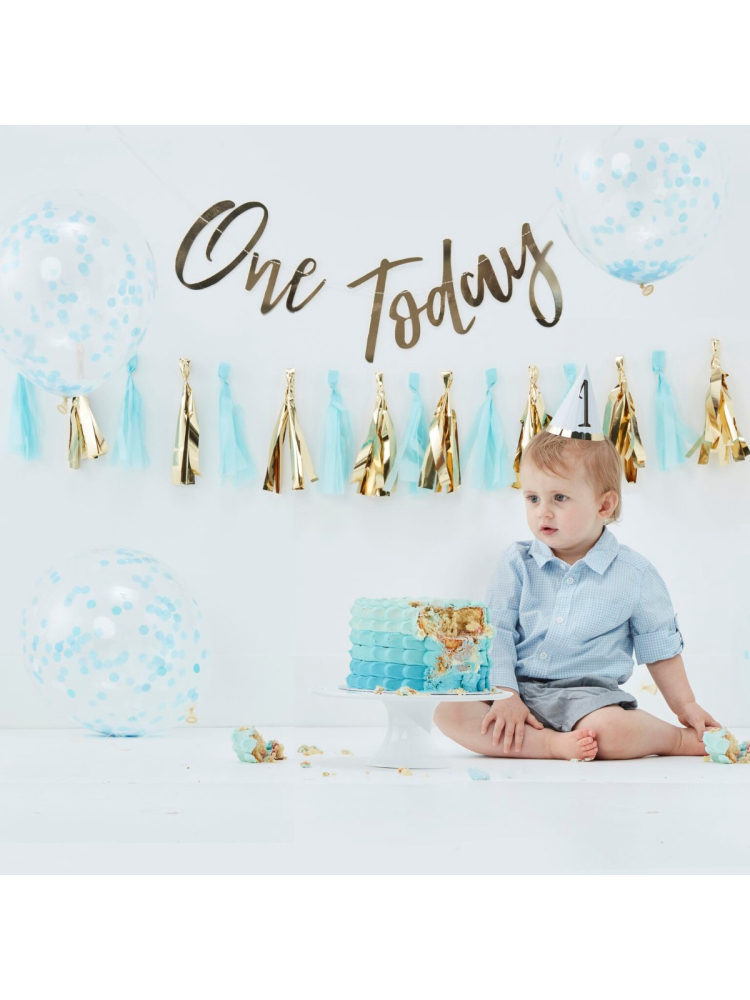 Inhoud: 1x One Today slinger, 1x feesthoedje, 16 tassels voor een tasselslinger en 5x confetti ballonnen.
