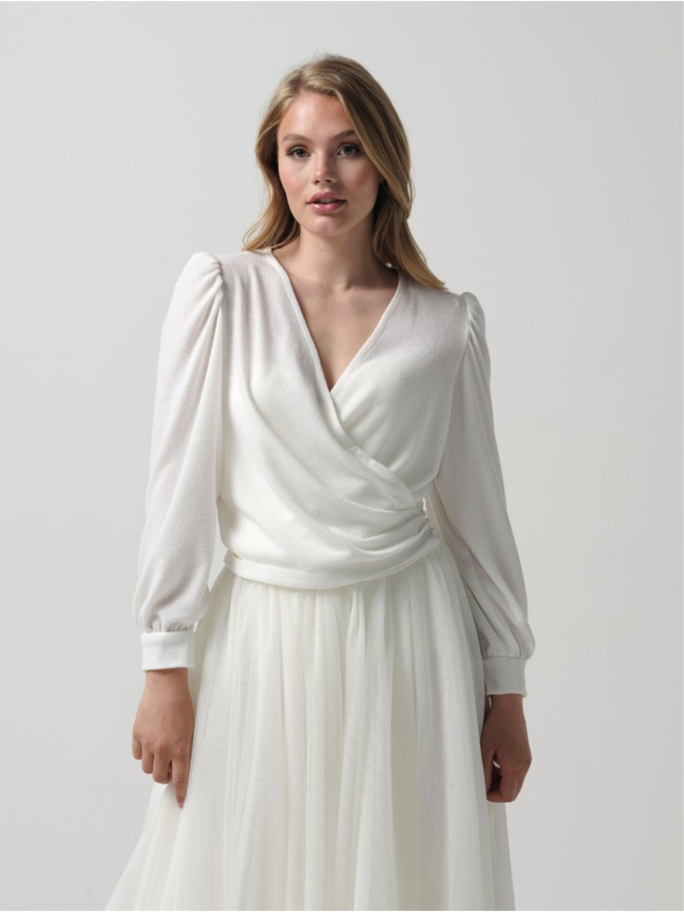 Elegante top met een v-hals uit de Essential collectie van Poirier. Deze top wordt aan de zijkant geknoopt. Deze top is goed te combineren met de bruidsrokken van Poirier.